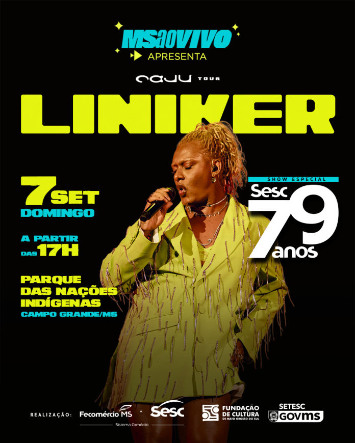 O Sesc MS está completando 79 anos de história e, para celebrar essa jornada de marcar essa jornada de transformação e cultura, irá realizar, no dia 7 de setembro, um grande show musical com a cantora Liniker, apresentando o álbum “CAJU”, a partir das 17h, no Parque das Nações Indígenas, em Campo Grande.